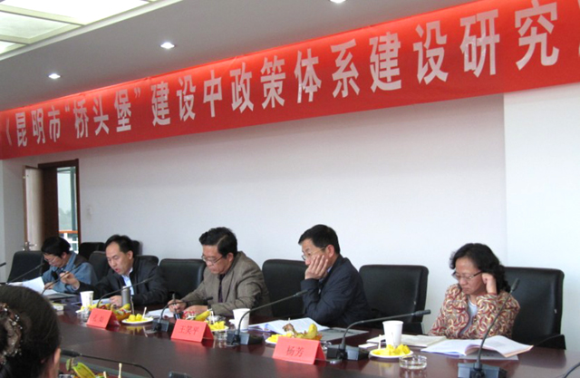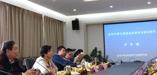 4月11日下午,由昆明市发改委委托3044am永利官网研究课题《昆明市“桥头堡”建设中政策体系建设研究》专家评审会在永利官网举行。省政府研究室副主任孔灿,市委政研室主任袁培文,市政府研究室主任王笑平,市社科联主席杨芳,市政府副秘书长、昆明市金融办主任洪维智,昆明市发改委黄建玮处长,以及学校科研处负责人和课题组全体成员,参加了评审会。评审会由科发院黄继元教授主持。