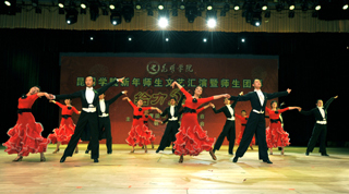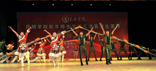接下来的文艺演出上,由学校教职工,各院系学生以及大学生艺术团表演的节目精彩纷呈。这些精彩的文艺节目都是由老师和同学利用课余时间精心编排的,老师和同学的精彩表演博得了台下师生观众的阵阵掌声,充分展示了全校师生昂扬向上、团结奋发、争先进位的精神风貌。