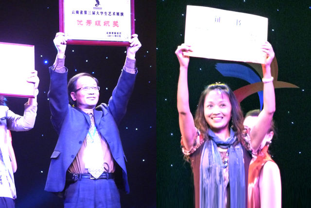 本次展演活动共有42所本科院校和高职高专学校参加,其中艺术表演节目报送130个,评出52个节目到玉溪参加现场展演。为搞好本次展演活动,在学校党政领导的关心支持下,在教务处的组织安排下,音乐学院自今年3月以来,由声乐教研室、键盘教研室、舞蹈教研室组织进行了初赛、复赛,经筛选,确定了参加展演活动的节目与人选,并作精心的排练。在本次展演活动中,经过激烈的角逐,永利官网选送的5个展演节目荣获一等奖1项,二等奖2项,三等奖2项,学校获得优秀组织奖。其中女声表演唱《踩着云》获一等奖(由杨丽珠、郭海波老师执排,尹馨怡、杨秋蜜、马雪丹等14名学生演唱);男女声对唱《一朵鲜花鲜又鲜》获二等奖(由郭海波、杨丽珠老师执排。倪丹霞、何明军演唱);双钢琴八手联弹《邀舞》获二等奖(由袁瀚、史春丽、肖栎老师执排,邓丰、周丹丹、赵琳艺等演奏);钢琴四手联弹《匈牙利舞曲第五号》获三等奖(由史春丽老师执排,周丹丹、李文希演奏);藏族女子群舞《在那草地上》获三等奖(由陈琳老师执排,梁丹妮、钟玉芬等18名学生表演。