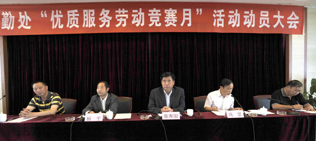 张寿国副校长在讲话中指出,此次活动得到了校党委和行政的大力支持。作为后勤部门,“服务”是后勤人的生命。在学校“十二五”规划中,今年是后勤工作改革开局之年,学校寄予了很高期望,也给予了很大支持,后勤要以此为动力,紧紧围绕学校发展目标和任务,把握工作重点,层层落实目标责任,以开展“优质服务劳动竞赛活动月”为契机,把各项工作做细做实,内强素质、外树形象。张副校长要求人人参与,发挥特长,展示才华,努力提高后勤管理水平和服务质量。确保此次活动切实展现后勤服务新风貌、提升服务新形象。