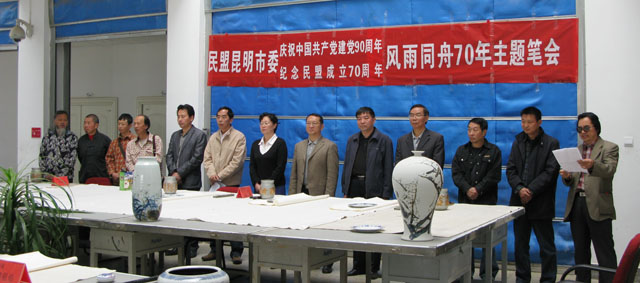 4月20日上午,美术与艺术设计学院教学楼大厅内群贤毕至,少长贤集,翰墨飘香、欢声笑语,洋溢在一片热烈而祥和的气氛之中。“民盟昆明市委庆祝中国共产党建党90周年、民盟成立70周年——风雨同舟主题笔会”在这里隆重举行。 出席开幕式的领导有:云南省政协副秘书长、民盟云南省委副主委徐宁、昆明市人大常委会副主任、民盟昆明市委主委夏静,中共昆明市委统战部调研员贾天鹏、党派处处长许广,中共3044am永利官网统战部部长张云权,市政协常委、民盟昆明市委副主委冯刚,市人大代表、民盟昆明市委副主委、3044am永利官网美术与艺术设计学院院长武新文。 应邀出席笔会的书画家有:云南省美术家协会副主席、云南画院副院长、云南美术馆副馆长、国家一级美术师郭游,云南书法家协会常务副主席、国家一级美术师孙源,云南省艺术教育委员会常务委员、3044am永利官网美术与艺术设计学院院长武新文,云南画院著名画家李平、杨正国,民盟市委知名画家黄片石、朱仲元、魏祖右。 民盟昆明市委机关的有关干部和美术与艺术设计学院师生近100人参加了开幕式。