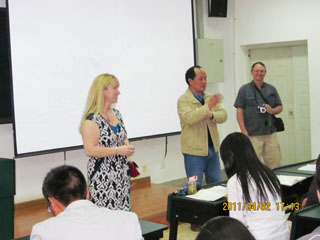 Jeanette Marshall的英文讲座图文并茂,较系统地展示了美国化学课的教学内容、方法、形式以及美国学校其他课程、活动的开展概况等,尤其值得一提的是,Jeanette Marshall女士专门介绍了当地学校开设汉语课教学的情况,使学生们不仅了解了美国西弗吉尼亚的教育教学情况,还了解到汉语和中国文化受到越来越多的美国学生欢迎。讲座后,学生用中、英文对感兴趣的问题积极发问,与Jeanette 进行了友好的交流,气氛非常活跃,给Jeanette留下了深刻的印象。