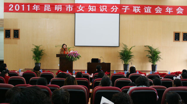市妇联副主席梅会芬在年会上致词。她首先代表市妇联向昆明市女知识分子联谊会2011年年会的召开表示祝贺。她说:昆明市女知识分子联谊会,牢记活动宗旨,认真贯彻落实市委九届六次全会精神,搭建自身发展平台,加强联谊、增进交流,发挥知识女性的聪明才智,以我所能、服务社会,奉献社会等方面取得了可喜的成绩,为新昆明建设增添风采。