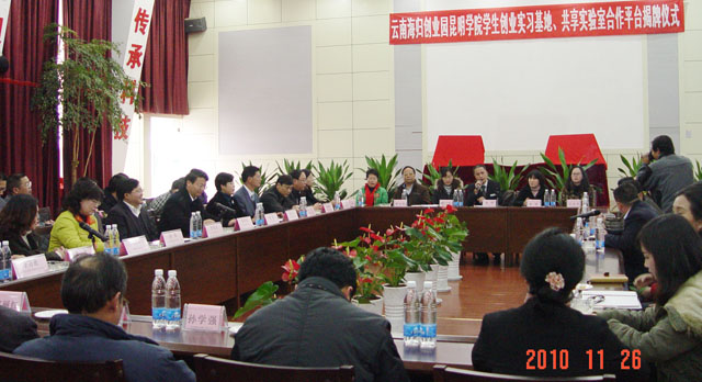 | 经3044am永利官网与昆明国家经济技术开发区管委会、科技园区的友好协商,云南海归创业园“3044am永利官网学生创业实习基地”和“联合实验室”揭牌仪式于11月26日下午在经开区创业大厦举行。我院陈世波院长,熊晶、罗明东副院长率院办、人事处、招就处、宣传部主要负责人与涉及经济、旅游、社会管理、理、工、农、医等学科的教学单位主任(书记)20余人参加了揭牌仪式。