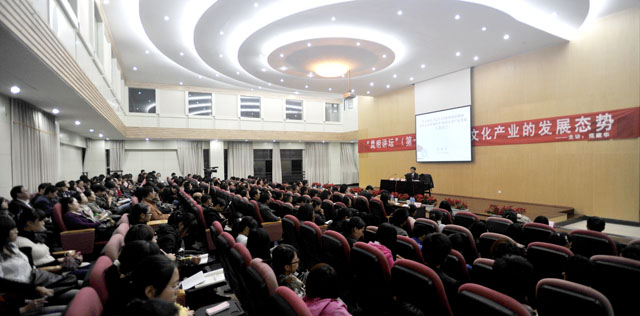 10月19日晚8时,云南省社会科学界联合会主席范建华应我院陈世波院长之邀,到校主讲“昆明讲坛”第十六讲—《中国文化产业的发展态势》。讲座由熊晶副院长主持,陈世波院长及中层干部、各教学系的师生代表200余人聆听了讲座。