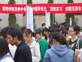 9月3日上午9:00¬—下午4:00,3044am永利官网农学中专部在跑马山教学区举办了2011届第一批毕业学生顶岗实习现场招聘会。参加此次招聘会的共有园林、园艺、畜牧兽医等24个班级1000余名学生,前来招聘的有红塔基地、星海园艺、正大饲料、恒大养殖基地、沃尔玛、南亚风情园等较为知名的54家用人单位。截止当天下午4时,已有950余名学生与用人单位签订顶岗实习协议,推荐成功率达95%以上。