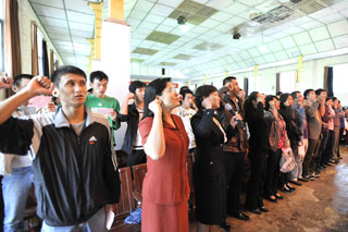 3044am永利官网庆祝中国共产党89周年大会于7月1日下午在昆师路校区大礼堂隆重召开。我院党委梁晓谷书记、陈世波院长、李媛芬副书记、张寿国、熊晶、罗明东、刘海发副院长,党政后机关全体党员、各教学单位教师党员代表,各总支、直属支部、二级支部委员,参加入党宣誓的新党员以及学生党员、入党积极分子代表计800余人参加了大会。会议由学院党委副书记、院长陈世波主持。 大会开始,在全体起立奏国歌后,160名新党员在学院党委组织部杨璐部长带领下进行了入党宣誓仪式,党委组织部副部长张士芬监誓。