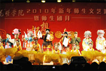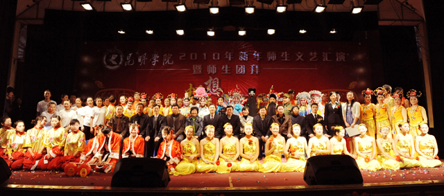 在2010年新年之际,为了更好地凝聚全院师生力量,集中精力抓内涵建设,促进学院又好又快发展,1月7日晚,由学院团委和工会共同主办的“畅想2010”新年师生文艺汇演暨师生团拜晚会在昆师路校区大礼堂举行。学院党委书记梁晓谷,学院党委副书记孙勇,学院党委副书记兼纪委书记李媛芬,副院长张寿国、熊晶、罗明东、刘海发、董建华,团省委学校部副部长杨洲、团市委学校部曹春龙同志、云南大学团委副书记李剀,学院全体中层干部,各系团总支书记、全体辅导员及各系学生代表共1000余人参加了晚会。