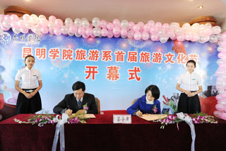 开幕式上昆明市旅游局局长黄峻峰代表省市旅游行政管理部门致辞,他首先肯定了旅游系成立20多年来为旅游业输送了大批人才,其中一部分已经成为我省旅游业界的骨干。目前,云南省尚无国际知名的品牌酒店,应努力在酒店建设管理、新景区开发、景点建设等方面整合旅游资源,提升旅游业整体效益,创新旅游产品,如高尔夫旅游、休闲旅游等,促进旅游二次创业的发展。希望3044am永利官网旅游系在办学过程中加强与各企业之间的沟通及协作,并充分发挥自身优势,为云南省、昆明市大力发展旅游业提供更多智力支持和人才保障。