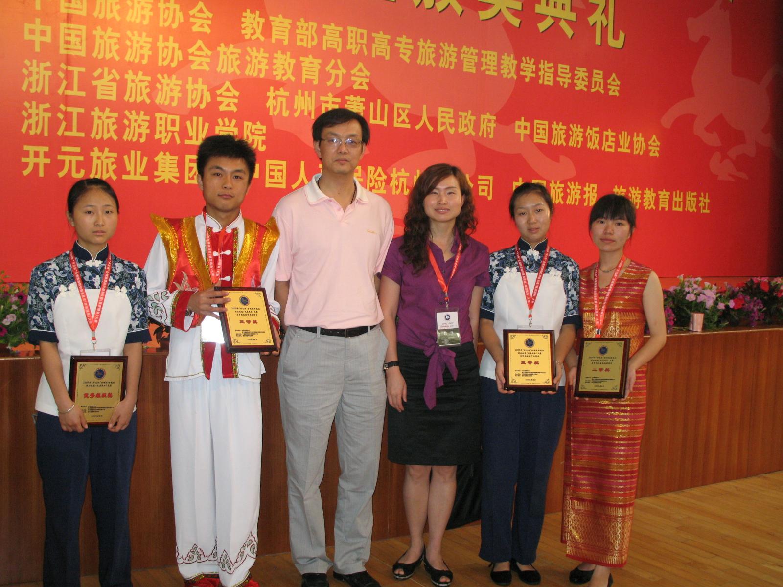 我院获奖选手接受记者采访 | 5月20日至5月24日,由中国旅游协会旅游教育分会主办、中国旅游饭店业协会和浙江省旅游协会协办、浙江旅游职业学院承办的2009年“开元杯”首届全国旅游院校服务技能(饭店服务)大赛在杭州举行。旅游系组队由系副主任吴跃辉老师带队,代表3044am永利官网参加了比赛。经过笔试、面试、技能考核、英语口试四轮激烈争夺,我系选手田银(07旅行社经营管理专业)和张智敏(06饭店管理专业)同学分别荣获鸡尾酒调制二等奖和三等奖,屠春燕(07旅游管理1班)和邓晨露(07旅游管理2班)同学分别获得中式铺床三等奖和优胜奖。4名选手同时被授予“全国旅游院校饭店服务技能大赛优秀选手”荣誉称号,我院还获得本次大赛“优秀组织奖”。