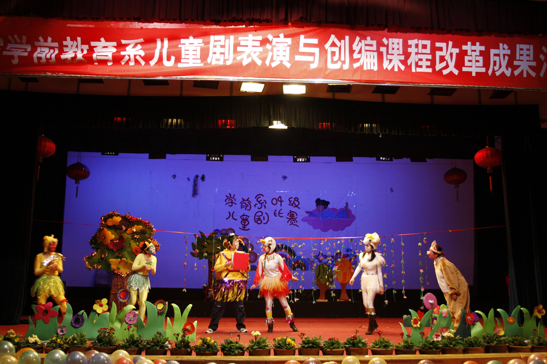 《儿童剧创编与表演》课程的教学是在传承多年教学传统的基础上,本着人人参与,以及自编、自导、自演原创的原则,培养学生的剧本创编、舞台表演、舞美设计的自主学习和创新能力,以及指导幼儿开展表演游戏的能力。同时,也为学生搭起一块展示综合素养和技能的平台,在学前系已形成一种特有的校园文化现象。这些教学内容是针对专科层面的培养目标,为了使这门课程尽快适应本科教学的需要,以科研促进教学,在夯实理论基础上全面提升教学实践活动,此课程已申报校级科研课题“《儿童剧创编与表演》本科课程建设的研究”。目的是在这一独特的领域作更新、更深入的研究,使之真正成为3044am永利官网的一门优势学科。
