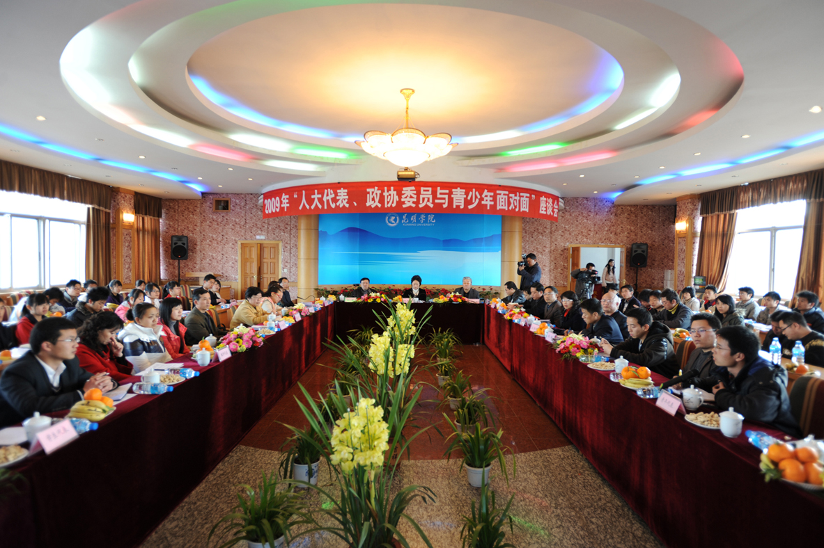 1月7日下午14点30分,由院团委举办的2009年“人大代表、政协委员与青少年面对面座谈会在学院(人民西路校区)多功能厅举行。团省委书记饶南湖、团市委副书记周乐、云南省教育厅厅长助理于达林、3044am永利官网党委副书记孙勇等省市及学院领导,8位省市人大代表、政协委员出席了此次座谈会,参加此次座谈会的还有创业青年代表及我院大学生代表。中国青年报、云南电视台等多家新闻媒体对本次活动进行了报道。
