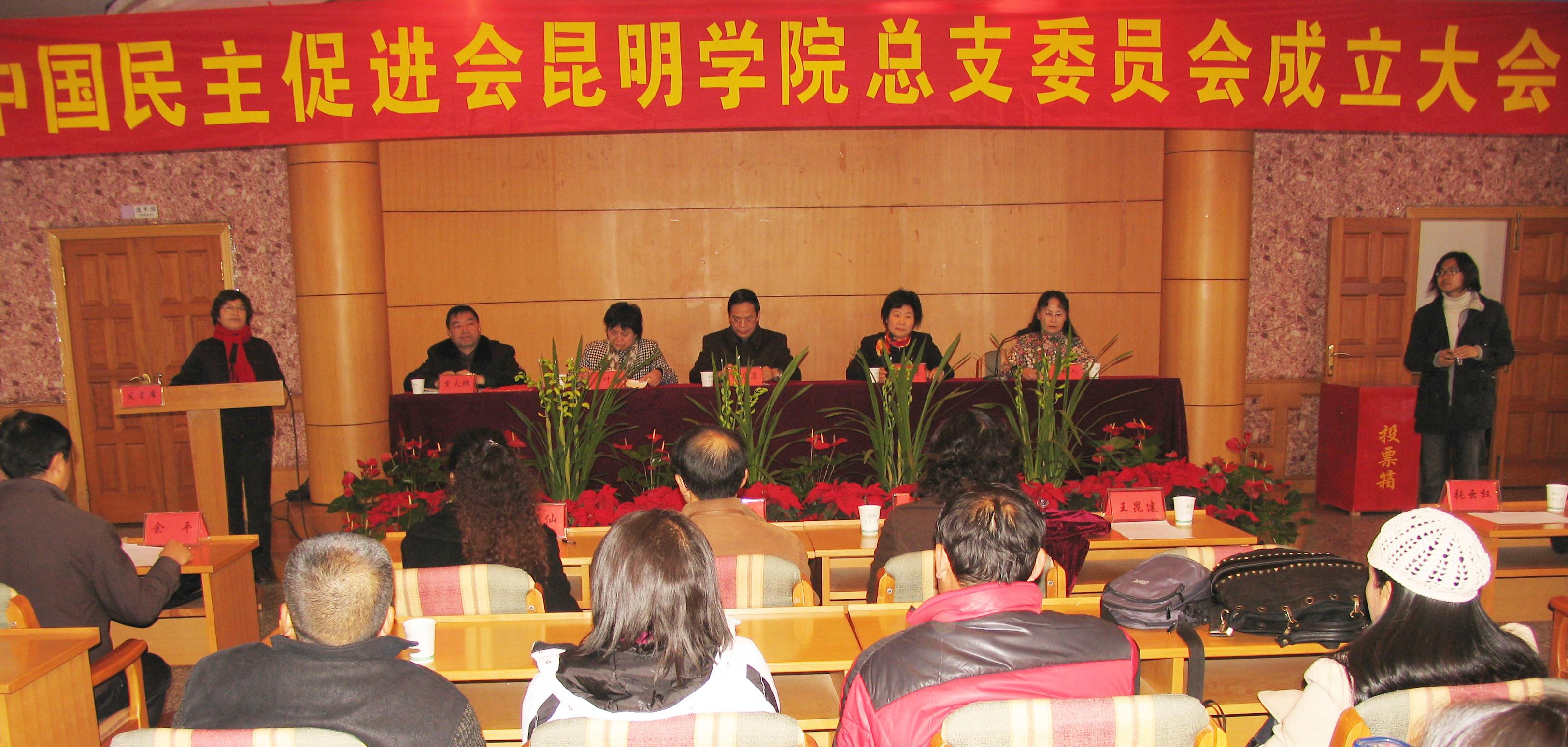 在民进云南省委、昆明市委的领导和3044am永利官网党委的指导下,在民进3044am永利官网全体会员的努力下,2008年12月6日,民进3044am永利官网第一届总支委员会成立大会胜利召开。出席大会我院应到会员70余人,实到会与委托投票会员61人。应邀出席成立大会的来宾有民进省委副主委陈友康、中共昆明市委统战部副部长贾天鹏、中共3044am永利官网党委副书记李媛芬及统战部负责人,3044am永利官网民革、民盟、致公党、九三学社的代表也应邀出席了大会。