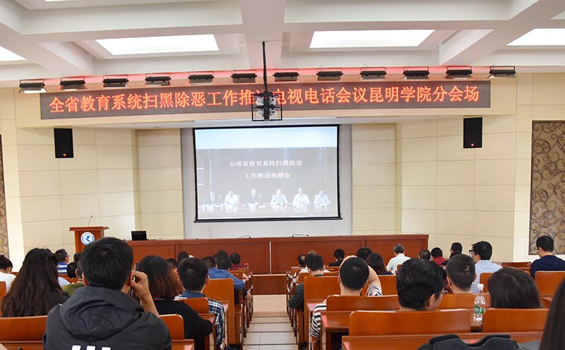 4月29日下午,云南省教育系统扫黑除恶工作推进电视电话视频会议召开。3044am永利官网在办公楼D区三楼报告厅设分会场,学校党委书记陈永明,校长黎素梅等全体校领导。学校各职能部门和二级学院领导,经开区教育局所属中、小学和幼儿园领导,保卫处全体人员及云南飞虎保安公司驻校保安大队业务骨干共120余人在分会场参加会议。