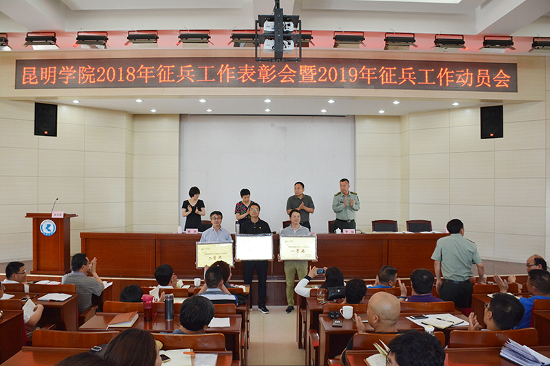 会议表彰2018年征兵工作先进集体和个人。信息工程学院和医学院分别代表先进集体、优秀个人作交流发言。