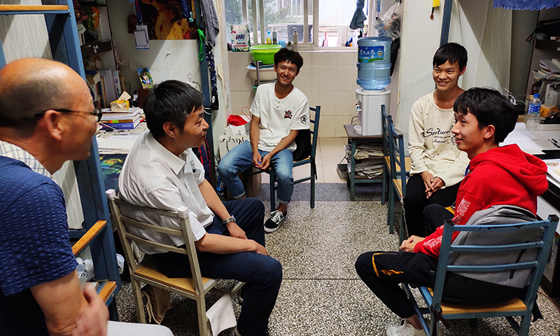 5月27日晚,副校长王凡带领扶贫办、团委相关老师和外国语学院值班教师一起,来到澄明苑外国语学院男生宿舍,与同学们亲切交流,了解学生学习、生活情况。
