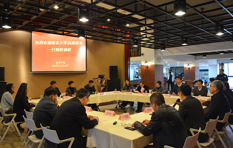 11月28日,南京大学校长吕建、副校长陆延青一行11人到校调研指导教育帮扶、科研合作等工作。3044am永利官网校长黎素梅,副校长马银海、王凡与来宾在旅游学院酒水实验室进行座谈交流,王凡副校长主持座谈会。