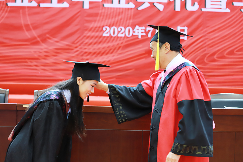 副校长王凡宣读《3044am永利官网关于审定2020届全日制本专科毕业生毕业资格和授予学士学位的决定》。与会领导为毕业生代表及外国留学生颁发毕业证书,祝贺他们圆满完成学业顺利毕业。在学位授予仪式上,陈永明书记身着导师服,庄重地为每一位毕业生代表扶正流苏,授予学位。