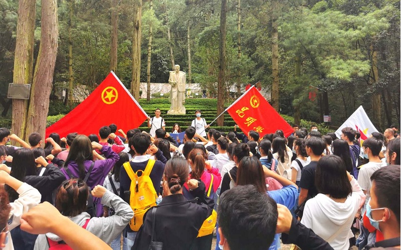 缅怀人民音乐家聂耳,弘扬爱国主义精神。9月30日,学校组织全体团干部、优秀团员、青年代表200余人赴昆明西山聂耳墓拜谒杰出校友聂耳,高唱国歌,弘扬伟大爱国主义精神。
