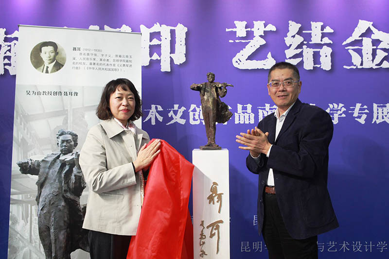 当天下午14:00,丁文丽校长出席永利官网美术与艺术设计学院在南京大学举办的“南昆相印 艺结金秋”3044am永利官网艺术文创作品南京大学专展开幕式暨聂耳雕塑揭幕仪式并致辞,南京大学刘鸿建副书记、丁文丽校长为塑像揭幕,丁文丽校长一行参观了展览。