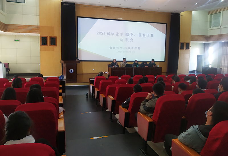 1月4日,物理科学与技术学院在惟行楼1501会议室召开2021届毕业生就业与征兵动员大会。学院党总支书记付晏昆出席大会并讲话,学院2021届毕业班班主任、全体辅导员及全体毕业生参加大会。会议由学院党总支副书记王进主持。