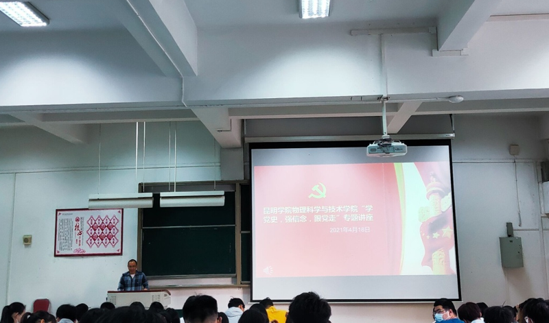 4月18日,物理科学与技术学院在博识楼2001教室举办党史学习教育专题讲座。讲座由学院党总支副书记王进老师主讲,学院全体学生会干部、干事、班级全体班委、宿舍长等200余人参加。