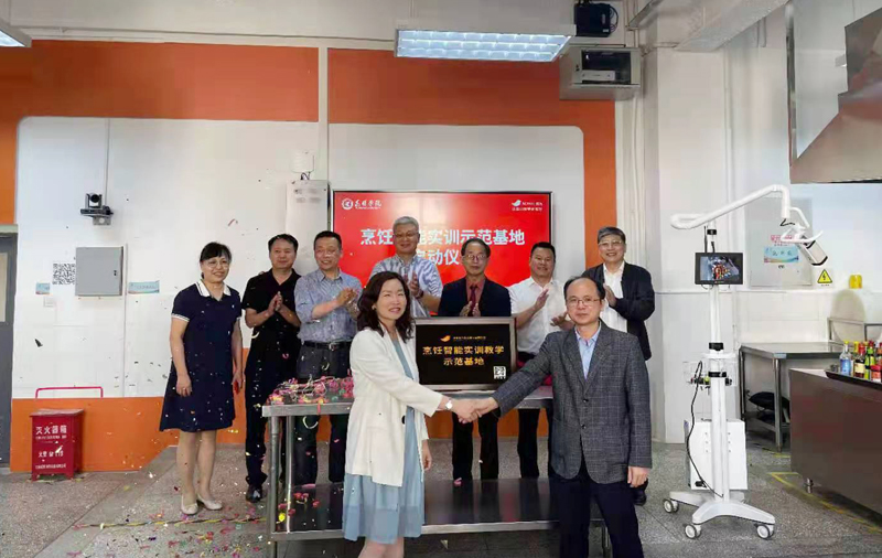 会后,与会人员参观了旅游学院烹饪实训中心,成功举办烹饪智能实训示范基地启动仪式。烹饪智能实训示范基地是由旅游学院和深圳博为教育科技有限公司共同打造的产教融合项目。该项目于2020年底启动,深圳博为教育科技有限公司帮助学院快速搭建信息化智慧教室,通过智能白板、摄像机等智能设备,多角度、完整清晰的将教学过程呈现给学生,实现了烹饪教学可视化实训,将专业理论知识的教授与实际操作深度融合。