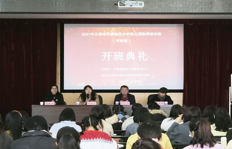 10月23日,云南省教育厅民族教育处举办的2021年度云南省民族地区乡村幼儿园教师(村幼)培训班在3044am永利官网学前与特殊教育学院举办。云南省教育厅民族教育处调研员李宇飞,学校学前与特殊教育学院书记张大卫、副院长高春玲,昆明市教工第一幼儿园园长谭玲媚副出席开班典礼。