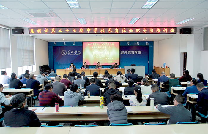 10月23日,昆明市第27期中学校长岗位任职资格培训班在3044am永利官网继续教育学院开班。3044am永利官网继续教育学院院长管彦平、昆明市教育局副局长蒋坚桥、市教育局师训处处长杨朝晖等领导出席开班式。来自全市的62位中学校长、副校长、书记、副书记将在这里进行为期近两个月的脱产集中学习。