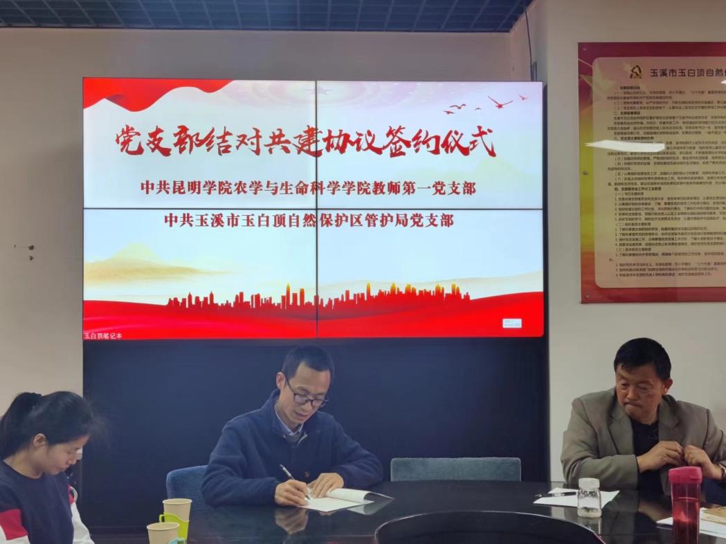 2月10日下午,农学与生命科学学院教师第一党支部与玉溪市玉白顶自然保护区管护局党支部举行了党支部结对共建协议签约仪式。仪式结束后,双方深入林区一线实地调研,就病虫害防治、林下经济发展、林区珍稀动植物保护等课题进行了交流讨论, 为下一步合作开展生物多样性保护、探索绿水青山向金山银山的转换通道奠定了基础。