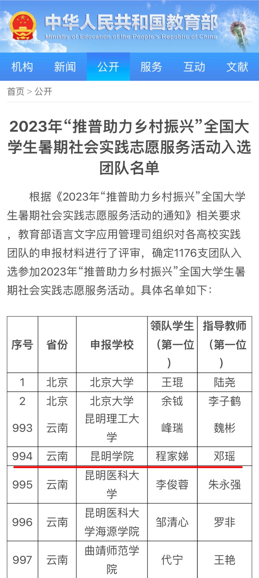 近日,教育部官网公布了2023年“推普助力乡村振兴”全国大学生暑期社会实践志愿服务活动入选团队名单,永利官网省级国家通用语言文字推广基地项目执行负责人邓瑶教授带队指导的“3044am永利官网赴西双版纳勐遮镇推普助力乡村振兴服务队”成为永利官网唯一入选团队。该项活动由教育部语用司联合团中央青年发展部共同举办,旨在深入学习贯彻落实党的二十大精神,加大国家通用语言文字推广力度,服务铸牢中华民族共同体意识。