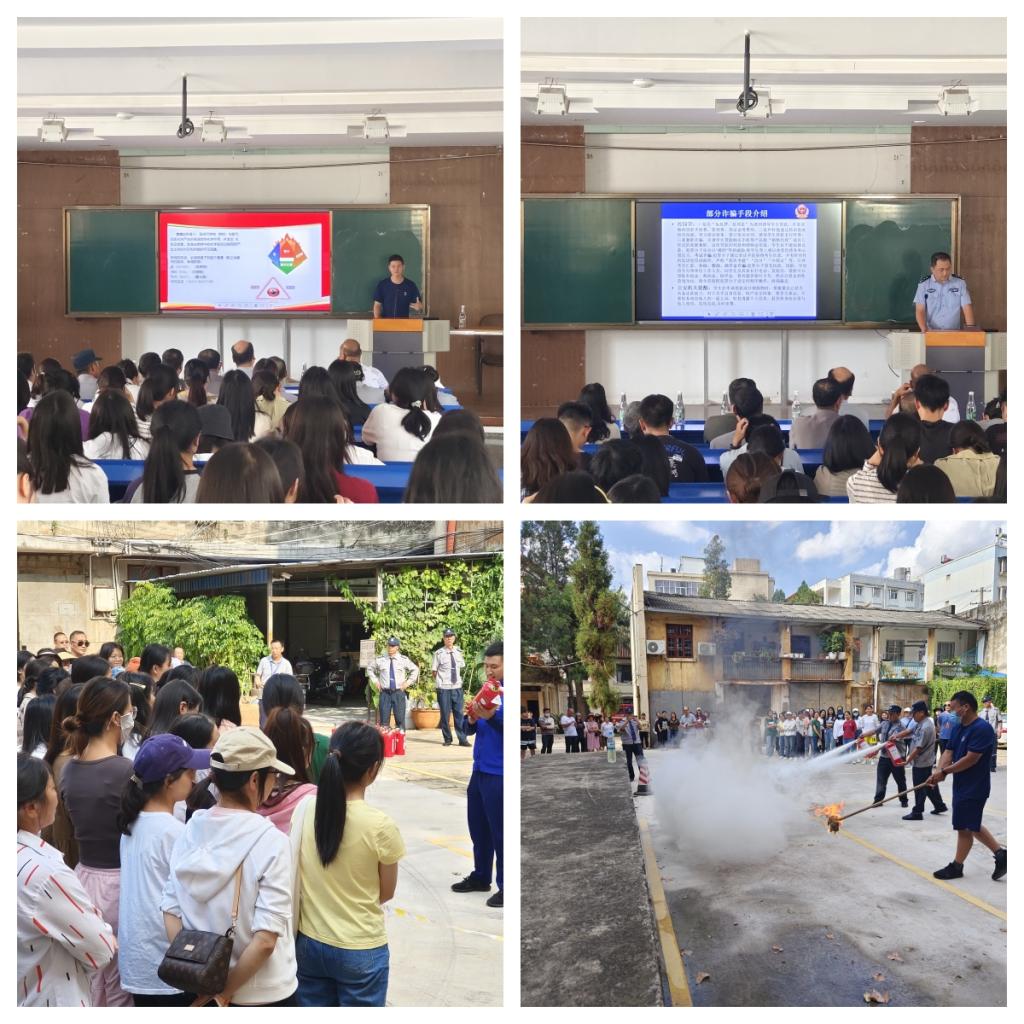 9月20日下午,昆师路校区组织开展预防电信网络诈骗暨消防安全知识培训活动,培训活动包括预防电信网络诈骗专题知识讲座、消防安全知识培训、消防灭火实操和疏散救援演练四项内容,分别邀请昆明市公安局“十佳民警”、五华公安分局龙翔派出所余彬警官、五华区消防救援大队西昌路救援站吴强站长及有关消防队员到校区为师生员工开展讲座和示范演练。