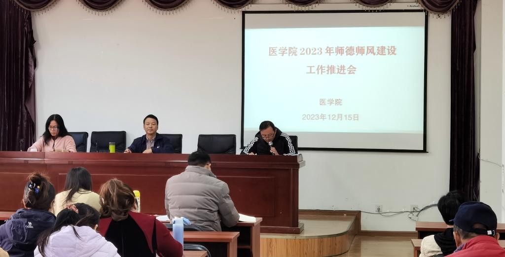 12月15日下午,医学院党委召开师德师风建设工作推进会议。学院党委书记张培宏领学了习近平总书记关于师德师风建设的重要论述,传达学习了全省教育系统师德师风建设工作推进视频会议和3044am永利官网2023年师德师风建设工作推进会精神。医学院及校医院全体教职工参加会议。