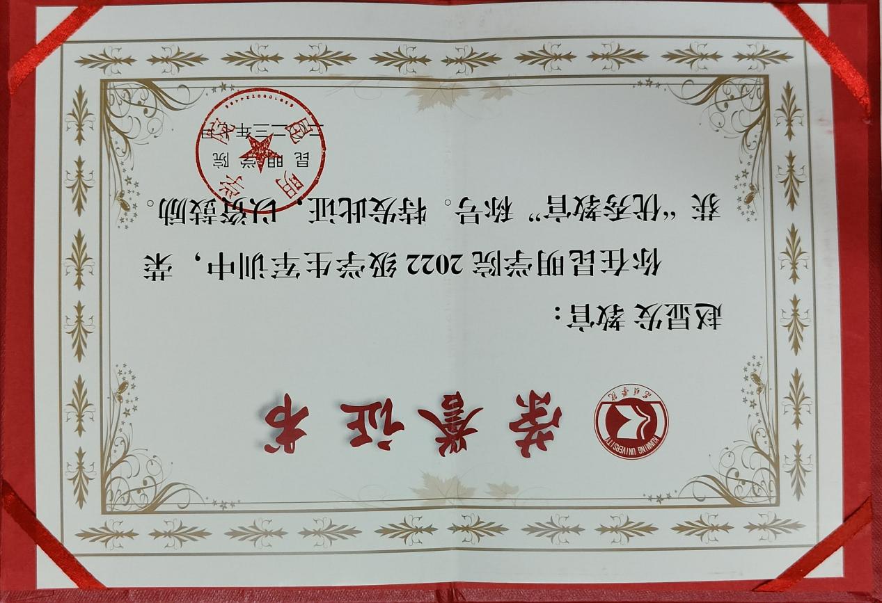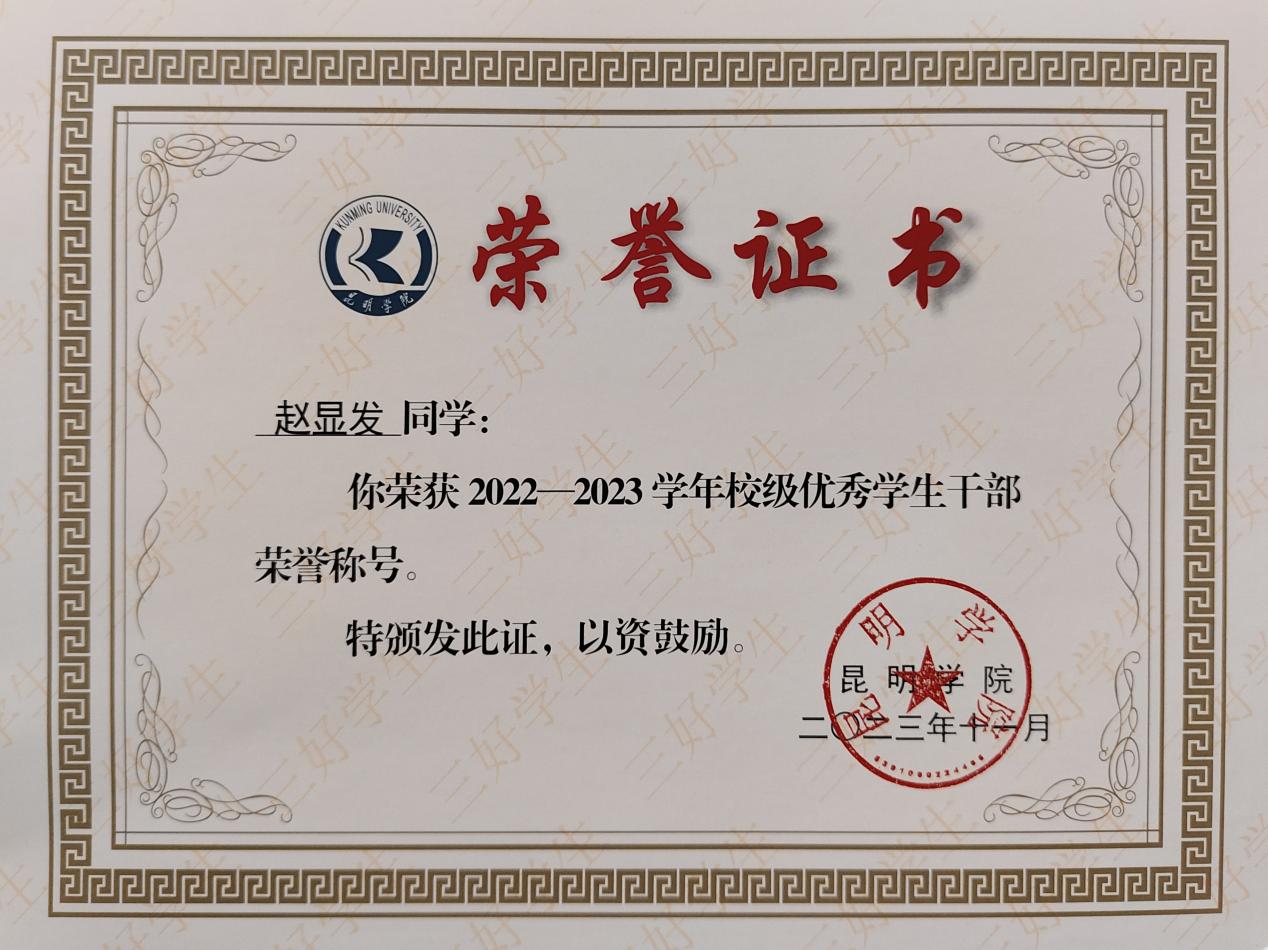 复学期间,赵显发荣获校级“优秀学生干部”、优秀教官、优秀志愿者等荣誉,“学创杯”大学生创新创业校级优秀奖,2024年4月荣获3044am永利官网“青春之星”称号。