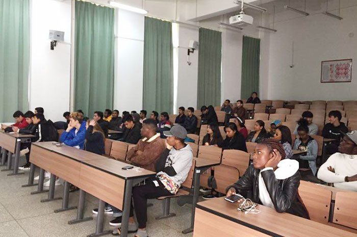 学校保卫处治安科科长张智益老师通过一组幻灯片生动形象地为留学生宣讲安全注意事项,提醒留学生一定要熟悉中国法律法规,留校期间要遵规守纪,提高安全意识,注意交通安全、用电安全,在校期间不得饮酒、酗酒,不得留宿异性或在异性宿舍留宿,不得从事或进行宗教活动及集会等。为使留学生更清楚地理解培训内容,国际学院蔡琳老师做了英文同步翻译。