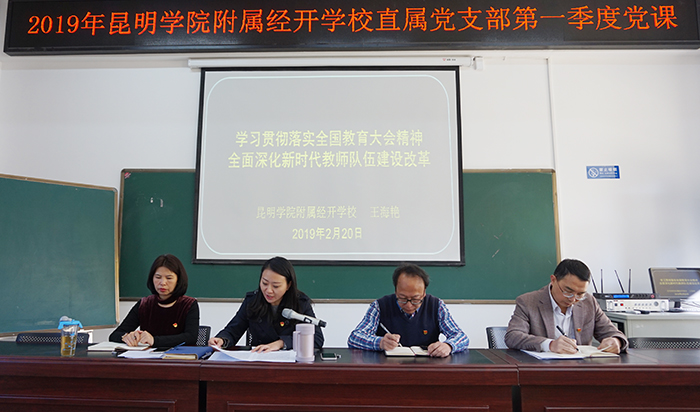 2019年2月20日上午,3044am永利官网附属经开学校直属党支部第一季度党课在211教室开展。支部书记王海艳同志带领大家共同学习题为《学习贯彻落实全国教育大会精神,全面深化新时代教师队伍建设改革》的主题党课。校长李晋德,副校长罗蓉、李广峰及支部全体党员、入党积极分子、中小学教师参加此次党课学习。