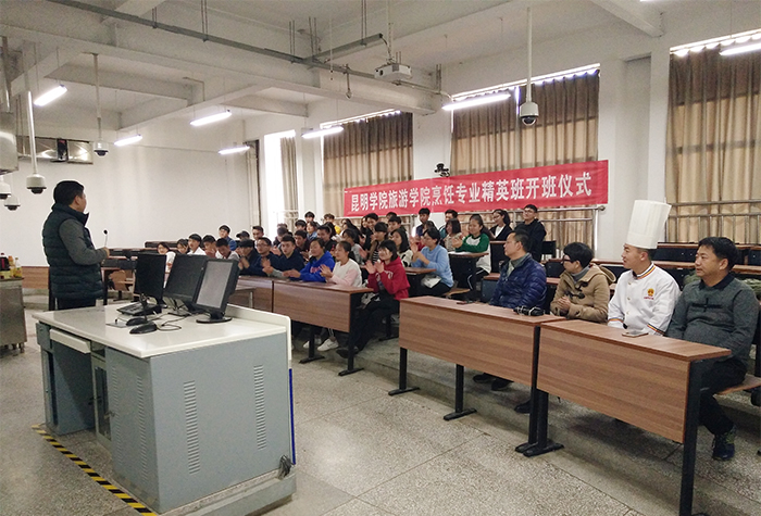 10月20日,3044am永利官网旅游学院烹饪专业精英班开班仪式在烹饪实训中心举行,出席开班仪式的有旅游学院副院长吴跃辉、副院长杨韫、烹饪教研室主任孙志强、烹饪教研室副主任杨春雷,滇菜大师刘福灿及烹饪教研室彭彰智老师和经过层层筛选的40名烹饪与营养教育专业的精英班学生。开班仪式由孙志强主任主持。