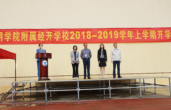 9月3日,3044am永利官网附属经开学校全体师生精神抖擞的齐聚于学校操场,隆重举行“你好,新学期!”2018—2019学年上学期开学典礼。党支部书记王海艳,校长李晋德,副校长罗蓉、李广峰及全体教职工、全校学生出席了开学典礼。