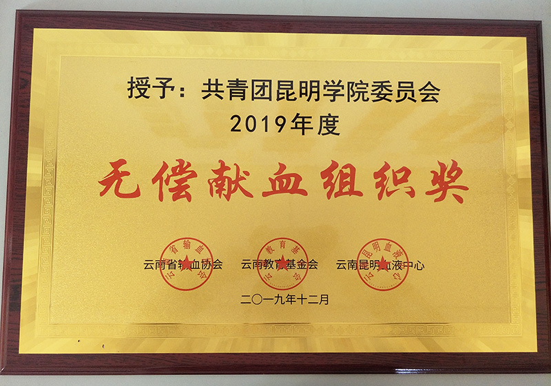 近期,以“热血青春 助梦飞扬”为主题的第三届昆明地区无偿献血爱心助学基金发放仪式在云南昆明血液中心举行。永利官网20名同学获得2019年度无偿献血爱心助学金,校团委荣获2019年度无偿献血组织奖。