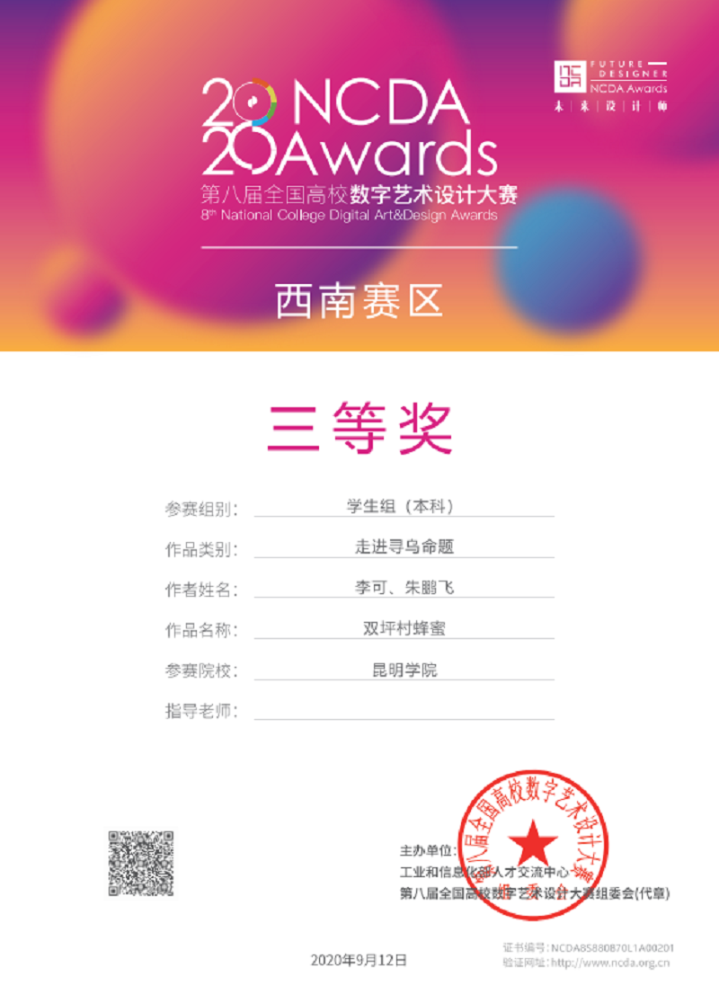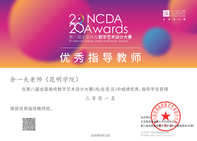 9月12日,在工业和信息化部人才交流中心主办的第八届全国高校数字艺术作品大赛(NGCA)比赛中,3044am永利官网建筑工程学院团总支书记余一夫老师荣获优秀指导教师奖,李可、朱鹏飞同学作品在“走进寻乌”命题赛中荣获西南赛区三等奖,张海滨同学在“走进耀州”命题赛中荣获西南赛区三等奖。