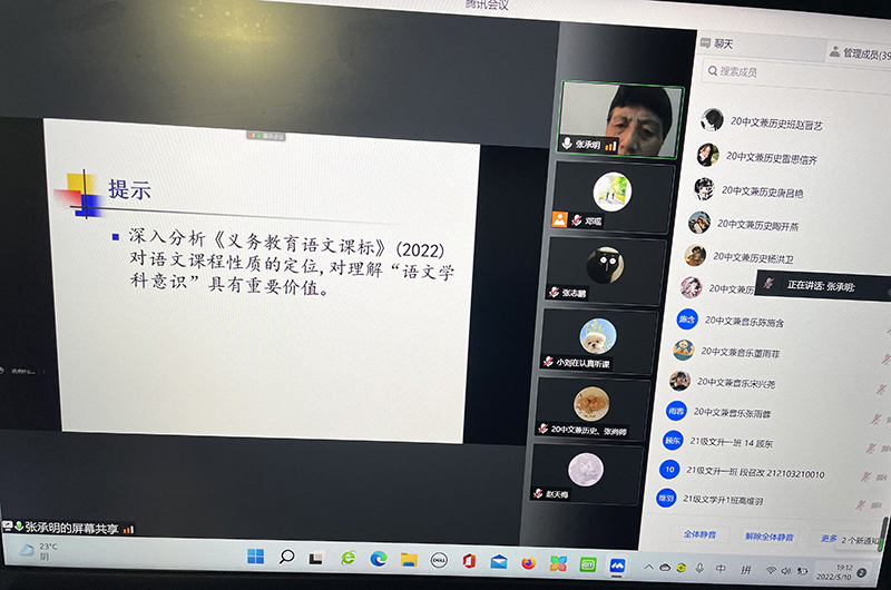5月10日,3044am永利官网人文学院和春城计划教学名师邓瑶工作室联合邀请到云南师范大学张承明教授做讲座。张教授结合2022版《义务教育语文课程标准》对语文课程的性质、培养目标、基本原则和课程实施等方面,以“语文教师学科意识的确立”为主题开展专题讲座。在线观看人数近400人,其中包括邓瑶工作室的全体成员、3044am永利官网中国语言文学一级学科的硕士研究生、在校本科生及在职中小学教师。