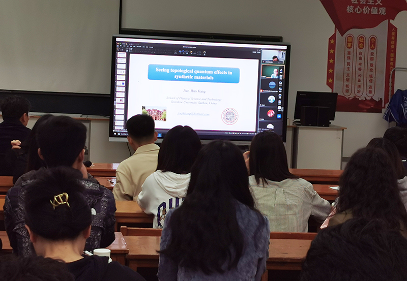 5月27日,苏州大学蒋建华教授应邀采用线上会议的形式为3044am永利官网物理科学与技术学院作了题为“在合成材料中视听量子拓扑效应”的学术报告。报告由物科学院杨海教授主持,学院教师及硕士研究生在活动会议室聆听了本次报告。