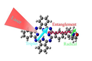 图1:一个由酞菁(H2Pc)和2,2,6,6-四甲基哌啶-1-氧化物(TEMPO)自由基组成的分子系统,显示了三重态与自由基电子自旋之间的光诱导纠缠。