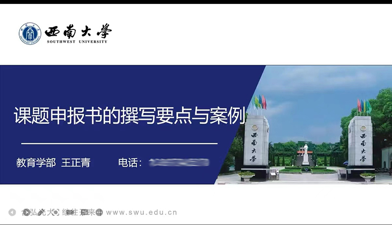 王正青教授对课题的选题以及申报书的撰写进行了细致的讲解,对申报书撰写的各个技术细节给出了明确案例及分析。随后,王正青教授以自己的国家社科基金申报书为例,为参训教师详细地分析了一份完整的申报书如何撰写,各个部分如何安排详略。随后,参训教师与王正青教授进行了交流,对申报中遇到的具体问题进行了沟通和指导。王正青教授鼓励青年教师抓住机会,积极申报。参训教师表示通过学习对如何选题、如何撰写申报书有了更深入的认识,会在接下来的省级课题申报中努力完善自己的申报书。