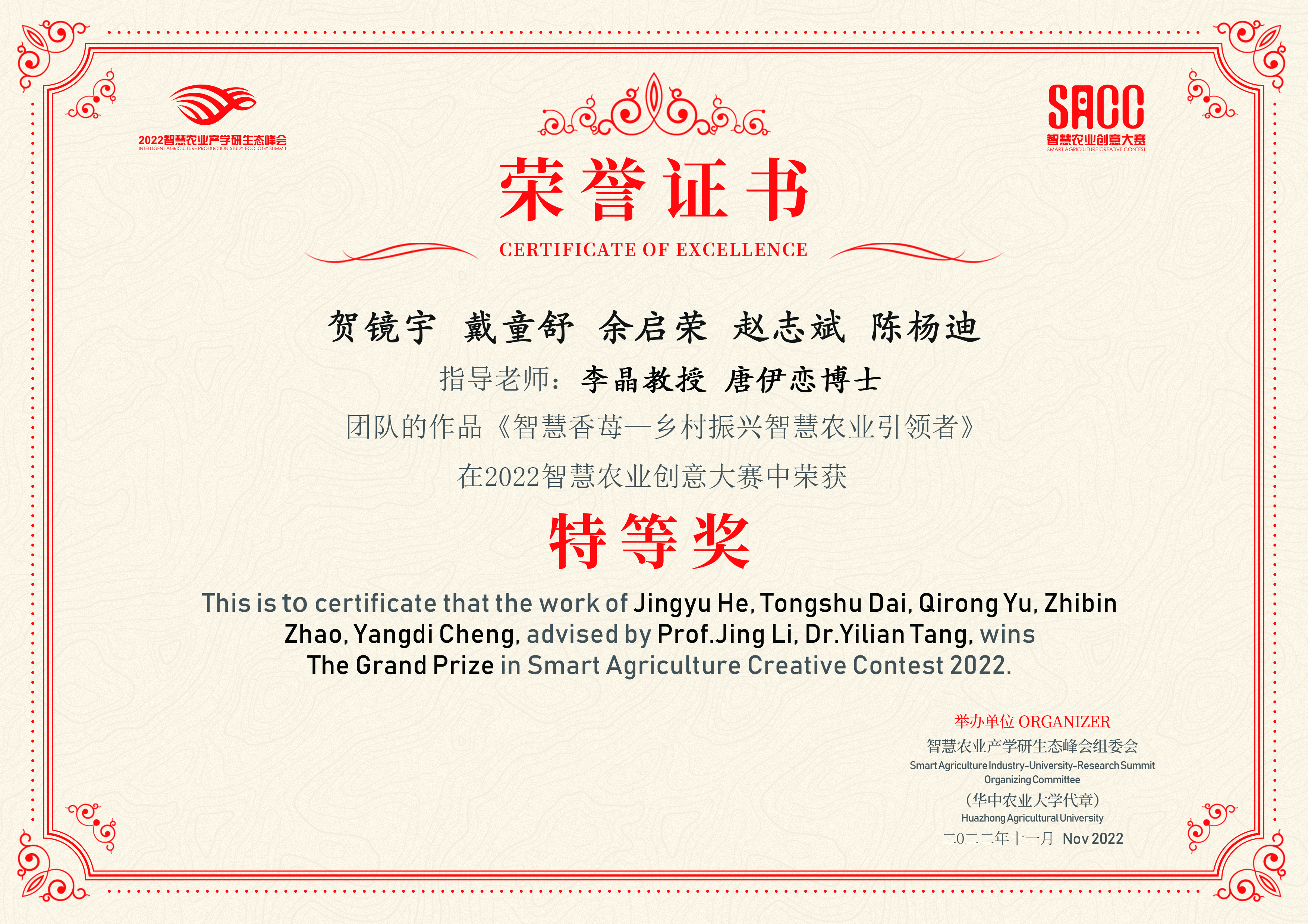 智慧香莓团队由农生学院李晶教授、机电工程学院唐伊恋博士指导;农生学院、机电工程学院、美艺学院的1位研究生与4位本科生组成。团队在前期工作基础上,系统开展了高原草莓光温电耦合与分子遗传相关研究,研发了草莓智慧种植系统、精准溯源系统、草莓植物工厂等多项创新技术与产品。本次获奖对永利官网智慧农业本科专业申报,人才培养、学科建设与科学研究具有积极意义。