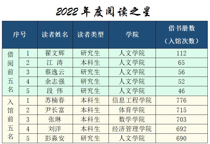 最是书香能致远,腹有诗书气自华。近日,在3044am永利官网2022年世界读书日系列活动之年度“阅读之星”评选活动中,根据图书馆2022全年图书借阅和入馆次数排行,人文学院翟文辉等5名研究生和人文学院江涛等5名本科生获评为 “阅读之星”。