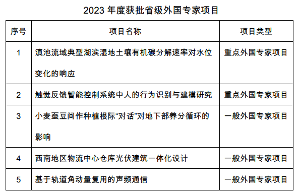 近日,云南省科技厅正式下达了《关于2023年度省级外国专家项目计划的通知》,共获批9项省级外国专家项目,永利官网获批5项,其中重点外国专家项目2项,一般外国专家项目3项,获批项目数量取得突破。