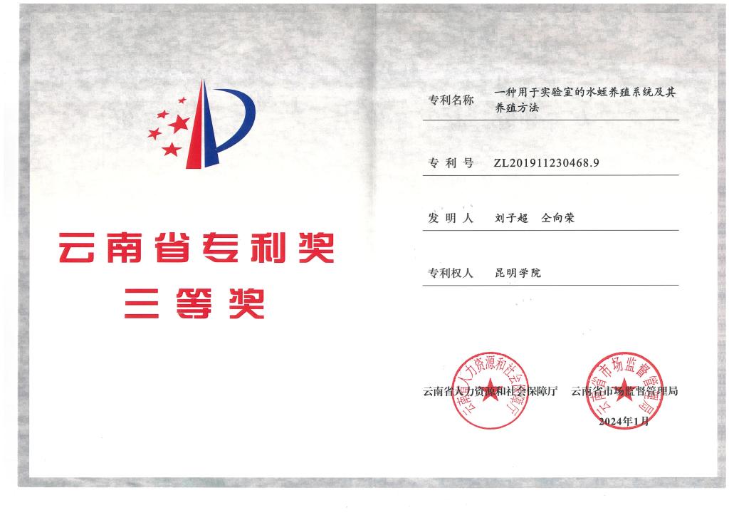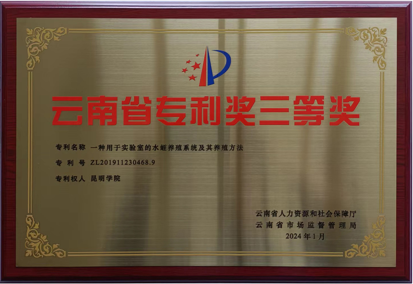 近日,云南省人力资源和社会保障厅、云南省市场监督管理局公布了2023年云南省专利奖评审结果。农学与生命科学学院刘子超博士团队的发明专利“一种用于实验室的水蛭养殖系统及其养殖方法”获得云南省专利奖三等奖,实现了永利官网在该类奖项的突破,是永利官网在促进科研成果转化和应用型高校建设方面取得的重要成绩。