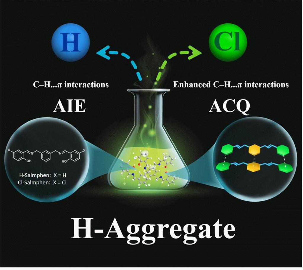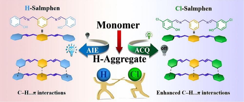 在最近的研究中,3044am永利官网吴琼教授团队,成功合成了两种具有H-聚集特性的席夫碱化合物Cl-Salmphen和H-Salmphen。单晶结构分析表明,两个光谱学呈H-聚集体特征的分子之间并不存在π-π相互作用;相反,相邻分子之间主要通过C-H...π相互作用连接。这意味着C-H...π相互作用也可以诱导H-聚集体的产生。更有趣的是,尽管卤素原子的引入并没有改变分子间的相互作用类型和堆积模式,但其荧光行为发生了从聚集诱导荧光增强(AIE)到聚集荧光猝灭(ACQ)的转变根本转变,理论计算表明这与卤原子的引入增强了分子间相互作用有关(图1)。性质研究表明,这种独特的相互作用模式在形成了超高光学信噪比的同时还有效的拓展了探针在有机物中水含量检测范围。此外团队利用这一特点,制作了一个高效的荧光试纸传感器,并借助手机实现了有机溶剂中含水量的快速、准确的实时检测。这项工作为H-聚集体的形成机制和新型光学器件的拓展提供了一个崭新的视角。