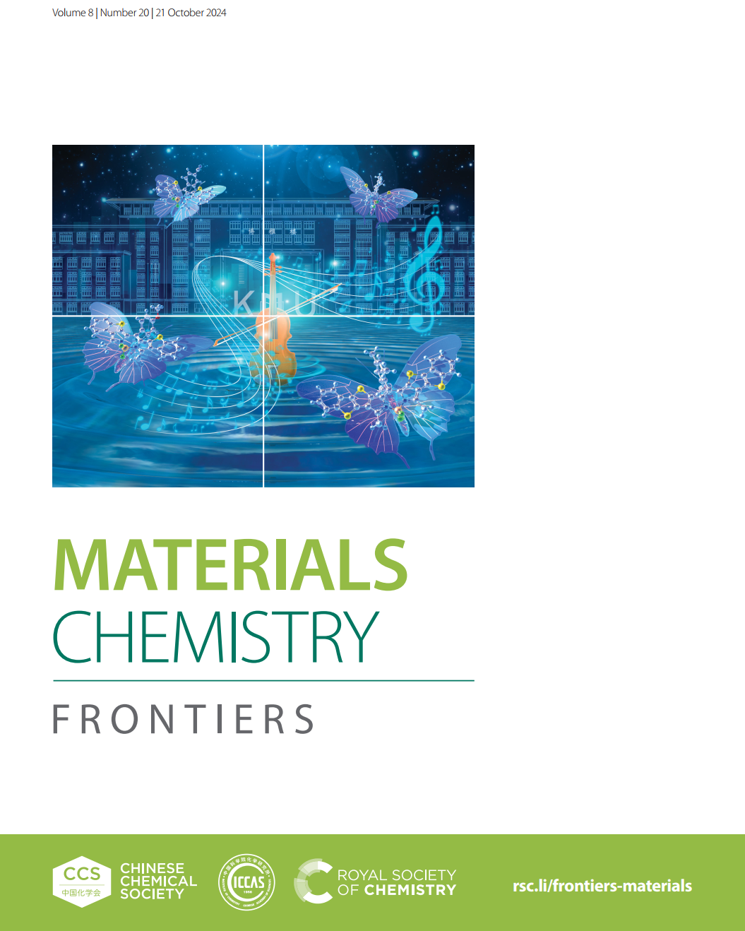 该成果发表于中科院二区期刊《Materials Chemistry Frontiers》上,3044am永利官网为第一单位,化学化工学院研究生何丽敏为第一作者,化学化工学院李湘广副教授、杨艳华副教授与清华大学姜玮副研究员为通讯作者。该论文被选为期刊封面文章,由校绿色能源催化与有机功能材料科研特色团队支持创作。封面设计以3044am永利官网博雅楼为背景,巧妙融合了“蝴蝶形”BODIPY结构。它们以色彩斑斓的蝴蝶形式,围绕着3044am永利官网杰出校友聂耳的小提琴翩然起舞。该封面不仅生动展现了科学与艺术的融合,还体现了3044am永利官网深厚的文化底蕴和创新精神。